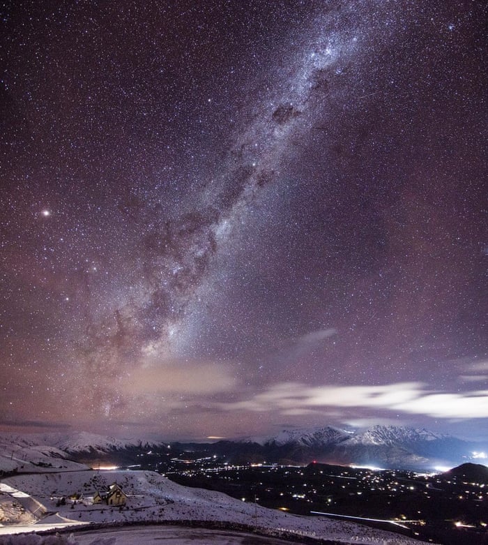 Ένα κατακόρυφο πανόραμα, το μικρό σπίτι φαίνεται σα μικρή φωλιά πλαισιωμένη από γαλαξίες και ουρανούς