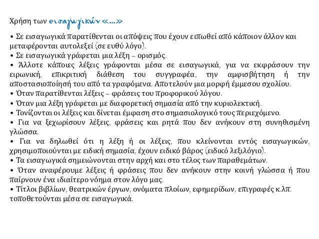 1. για να παρουσιάσουν τα λόγια κάποιου που μεταφέρονται αυτούσια: «Η δύναμη